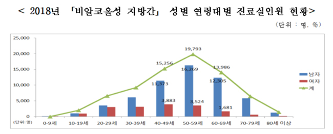 지난해 연령대별 진료현황을 보면, 알코올 사용장애 전체 진료인원 중 50대가 1만9793명(26.5%), 40대 1만5256명(20.4%)으로 알코올 사용장애 진료인원은 50대가 가장 많았다.