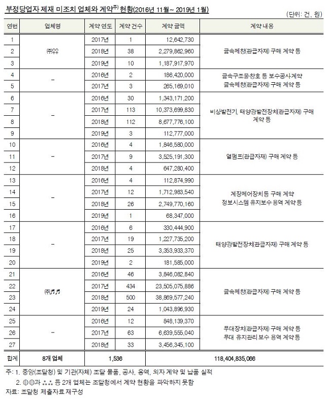 해당 10개 업체는 입찰 참가 자격 제한 조치를 받지 않은 채 1184억원의 조달 계약을 체결했다.