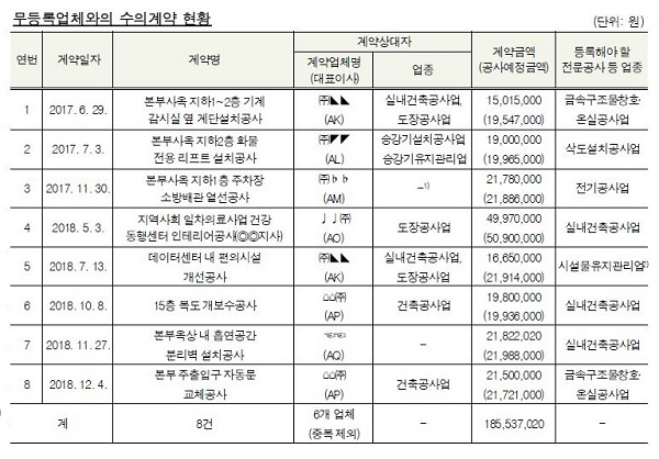 또한 '분리 발주' 등 편법 사례도 확인됐다. 예를 들어, 공사 시기·장소를 고려했을 때 굳이 분리 시공할 필요가 없는 본부 옥상 내 흡연공간 설치 공사를 '본부 옥상 내 흡연공간 분리벽 설치공사'와 '본부옥상 내 흡연부스 구매 및 설치공사'로 분할해 특정 업체와 수의 계약을 체결했다.