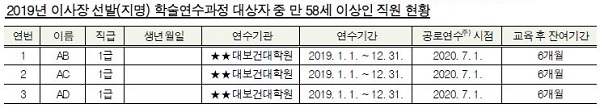 또, 1·2급 상위직 직원 위주로 학술연수 대상자를 선발한 것으로도 확인됐다. 2016년 이후 120명 가운데 1·2급 상위직 직원은 96명인 데 비해, 3급 이하 직원은 24명에 그친 것이다.