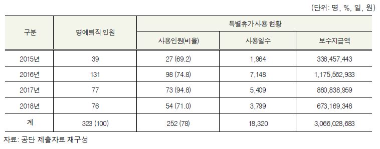 이 과정에서 최근 4년(2015~2018년)간 명예퇴직한 323명 중 252명이 특별 유급휴가를 부여받았다. 이들의 휴가 기간은 총 1만8320일이었으며, 지급된 보수는 30억6602만원에 달했다.