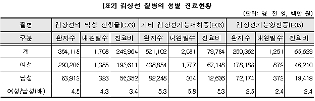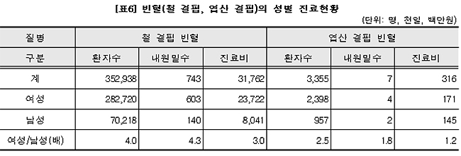 특히 갑상선 저하증 질환자 수는 남성의 5.3배 많고 철 결핍에 의한 빈혈 환자 수는 28만여명으로 남성보다 4배 많은 등 특징이 두드러졌다.