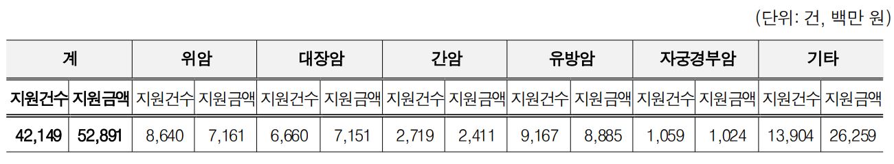 이런 방식으로 지난해 기준 5대 암 진단을 받은 4만2149건에 대해 의료비 529억원이 지원됐다.