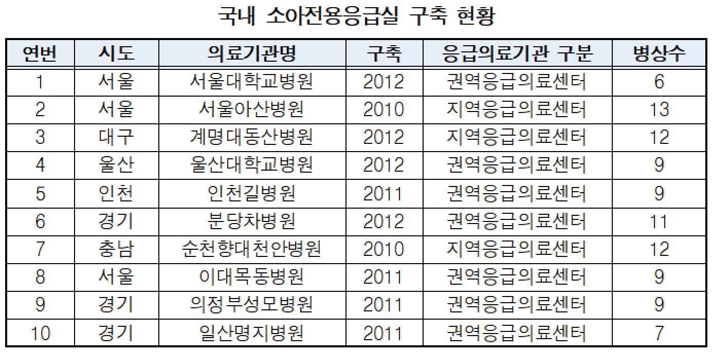 장 의원에 따르면 현재 소아전문응급의료센터가 설치된 응급의료기관은 전국 10곳에 그친다.