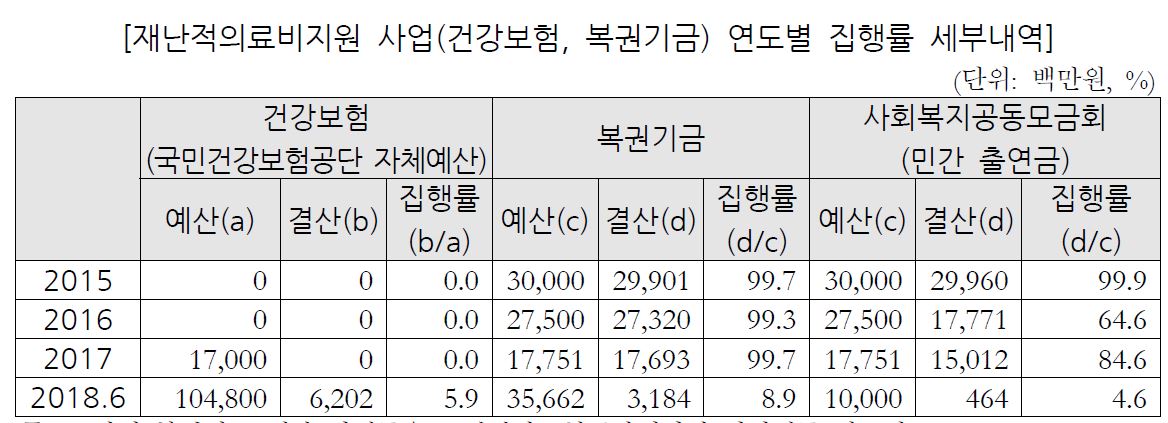 대신 집행비 대부분은 복권기금과 사회복지공동모금회 지원금(민간)에서 충당됐다. 지난해 기준 복권기금에서 재난적의료비 지원사업 예산은 177억5100만원이 편성돼 99.7%인 176억9300만원이 집행됐다. 사회복지공동모금회 역시 177억5100만원을 출연해 84.6%인 150억1200만원을 사용했다.