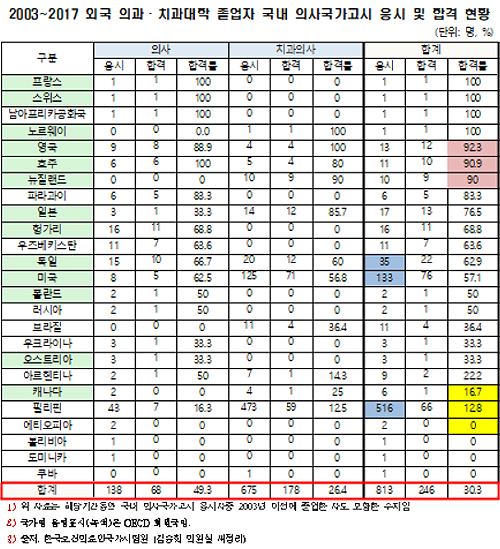 국시원에 따르면, 2003년부터 2017년까지 해외대학 출신 국가별 의사·치과의사국가고시 응시자는 총 813명으로 필리핀 516명, 미국 133명, 독일 35명 순으로 나타났다. 반면 합격자는 총 246명(30.3%)으로 응시자 3명 중 1명이 합격한 것으로 밝혀졌다. 이는 국내 의사·치과의사 국가고시 최근 5년간 평균 합격률이 94.8% 인 점을 고려하면 저조한 수치다.
