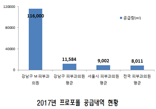 이를 ml로 환산할 경우, 지난해 11만6000ml, 2016년 4만9800ml, 2015년 1만6000ml인데 2015년부터 2018년 3월까지 전국 피부과 의원이 공급받은 프로포폴 평균보다 월등하게 높았던 것으로 드러났다. 특히 지난해부터는 강남구, 서울시, 전국 평균보다 10배를 상회하는 프로포폴을 공급받았다.