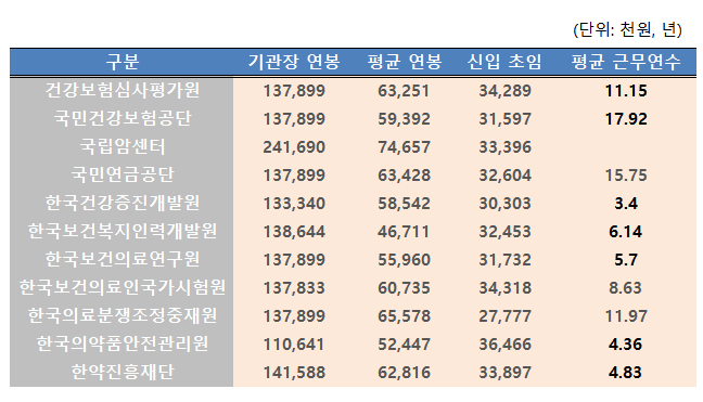 압도적인 1위는 평균 7400만원의 국립암센터로, 이 기관의 기관장은 2억4169만원을 연봉을 받는다. 반면 신입사원 초임은 한국의약품안전관리원이 3646만원으로 가장 많았고, 근무연수는 건강보험공단이 17.92년으로가장 길었다.