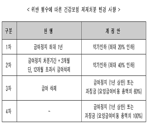 구체적인 제재수위는 1차-급여정지 최대 1년, 2차-급여정지 처분기간+2개월 가중(1개월 초과 시 급여 삭제), 3차-급여삭제 등으로 정해졌다. 예외적으로 급여정지에 갈음해 과징금(연 급여비 총액의 40% 상한) 대체도 가능하도록 했다.