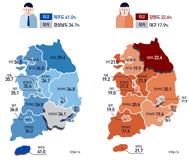 광역시별 남녀 성인 비만율의 경우 남성은 제주도에서 41%로 가장 높았고, 여성은 강원도가 22.4%로 1위였다. 최저 비만율은 남성은 경상남도 34.1%, 여성은 대구 17.9%다.