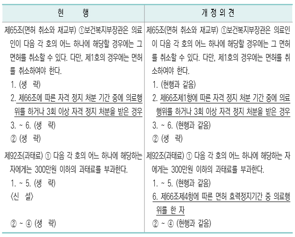 구체적으로 의료법 65조1항2호를 '66조1항에 따른 자격정지 처분 기간 중 의료행위를 하거나 3회 이상 자격정지 처분을 받은 경우'로 개정하고, 취업상황 등의 신고 의무 및 보수교육 의무 불이행에 따른 의료인의 면허 효력 정지기간 중 의료행위를 한 경우에 대한 제재처분은 별도의 실효성 확보 수단을 마련한다.