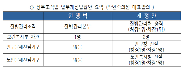 또 보건복지부 차관을 2명으로 늘려 보건의료 분야와 사회복지 분야를 각각 전담하도록 했다. 조직의 전문성 및 효과성을 제고하고, 우리 사회의 심각한 문제가 되고 있는 저출산 고령화 문제에 대응하기 위한 것이라고 박 의원은 설명했다.