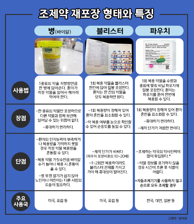 실제로 중증질환 환자가 많은 문전약국도 PTP째로 환자에게 주기보다 전부 까서 다시 조제를 하는 경우가 더 많다. 고령화가 진행되고 노인 환자가 많아지면서 전세계적으로 약물 재포장이 주목받는 이유다.